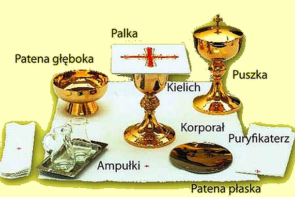 Paramenty - Szaty liturgiczne; oficjalny strój osób pełniących różne funkcje w liturgii, a także bielizna kielichowa (korporał, puryfikaterz, palka) i ołtarzowa (obrus).