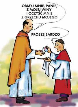 Obmycie rąk- Znaczenie tego gestu dobrze wyraża modlitwa kapłana zaczerpnięta z Księgi Psalmów: “Obmyj mnie, Panie, z mojej winy i oczyść mnie z grzechu mojego”.